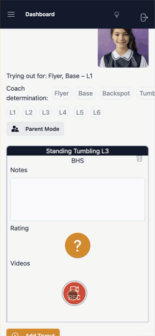 Experience the power of the CheerSync App, where capturing and organizing athletes’ tryout skills is a breeze. With our easy-to-use video recording feature, effortlessly save and categorize each athlete’s tryout skills, ensuring a streamlined team selection process. Simplify your selection process and make confident decisions by easily accessing athletes’ tryout skills at your fingertips!